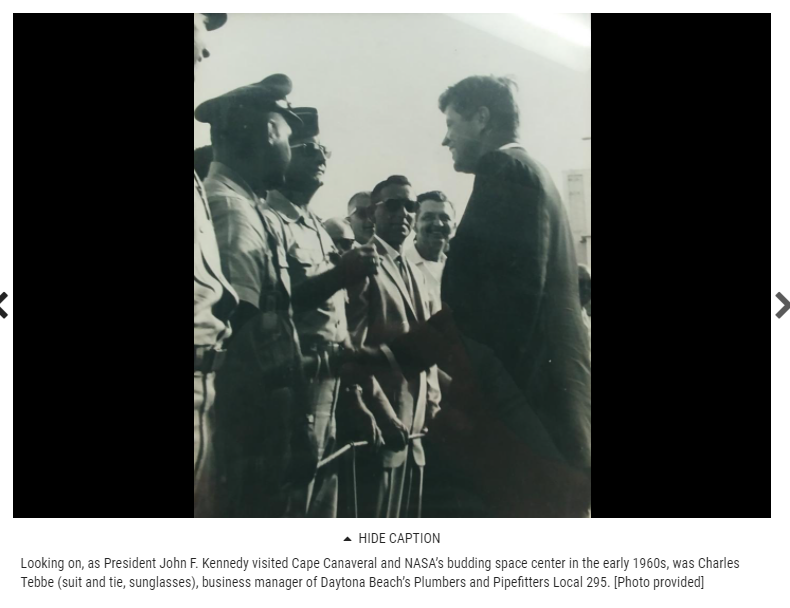 Local 295 was chartered on December 6, 1913. We have a long and proud history of serving both the Daytona Beach community as well as the world. Our local played integral part in the history of space exploration. Over 200 of our members spend time annually working at the NASA and Blue Origin facilities. We are especially proud of the work that did around the time of the "Space Race". Below is an image of our Business Manager at the time and President John F. Kennedy.